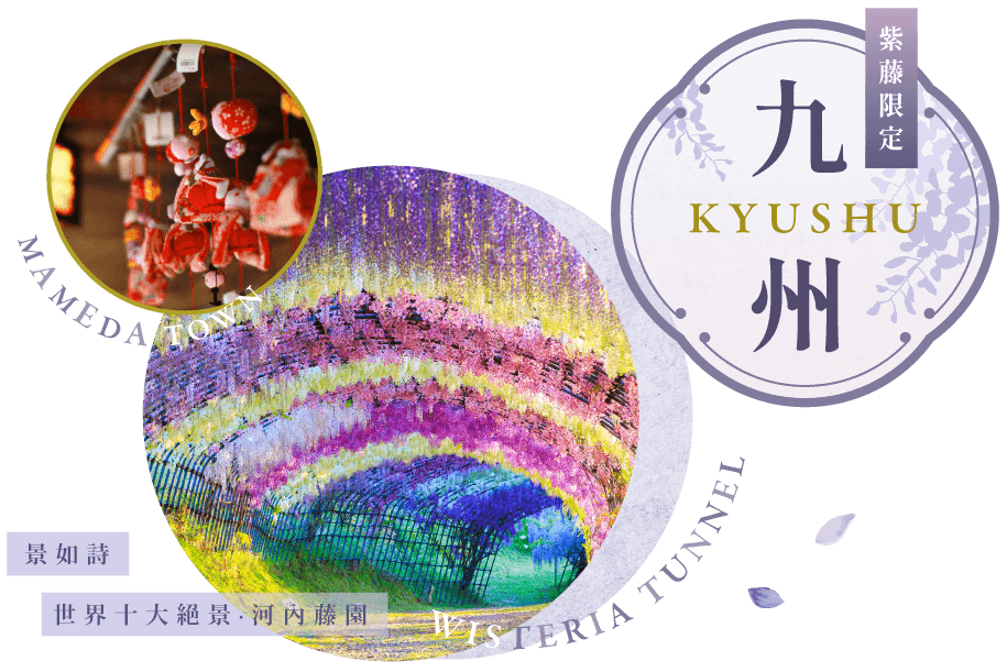 紫藤掛雲木.世界10大絕景.河內藤園(預約OK).藤花瀑布~ 北九州風情:【A. 門司港古跡.門司港懷舊遊船 或 B. 小倉城.各式體驗設施】 ~ 福岡夜未眠