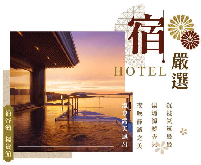 油谷灣 楊貴館:「春寒賜浴華清池,溫泉水滑洗凝脂。」位於可俯瞰日本海的油谷灣上,擁有著「美人の湯」美稱的溫泉。
