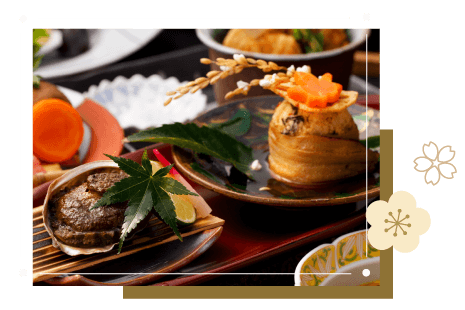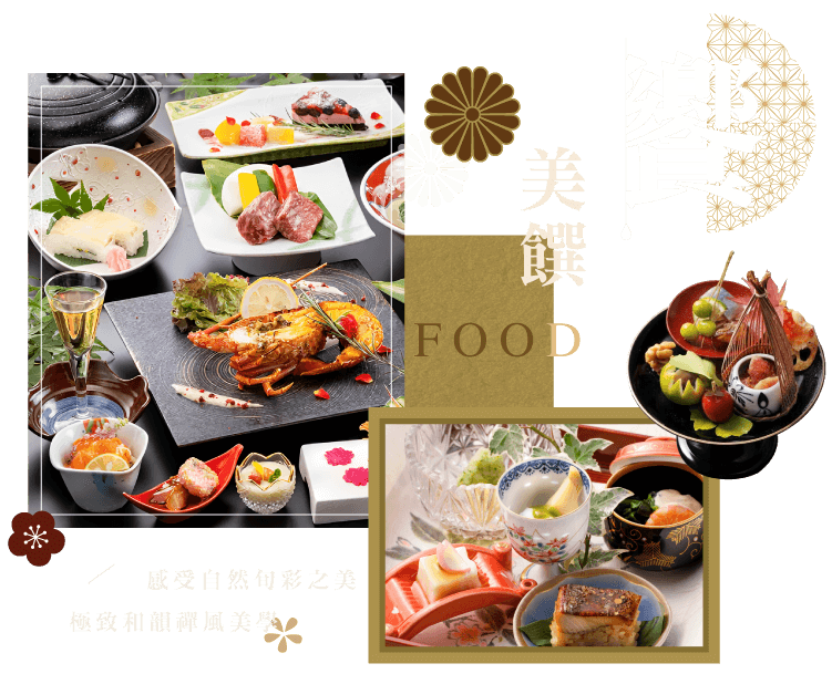 溫泉旅館會席:聽著風吹過山川草木聲音,看著窗外春櫻、夏綠、楓紅、雪舞;「款待的心」結合「和韻之美」,今晚,代表溫泉旅館的會席晚宴,就從第一品料理開始上演。