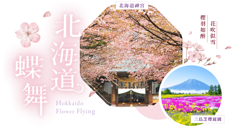 櫻!丹山公園、北海道神宮、真駒內公園,梅!平岡公園,鬱金香!瀧野鈴蘭公園…等,春城無處不飛花,陽光透過花瓣間隙灑落,粉紅色花朵翩翩飛舞,更增添春色美麗浪漫氛圍。