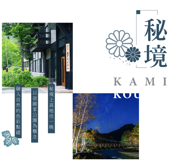 上高地五千尺飯店:評估晴日團隊長久以來,客人優、品質好,與晴日聯合企劃「上高地住一晚」,以最長時間與最輕鬆寫意的停留。尊貴而稀有限量8間房,推廣給台灣貴賓。