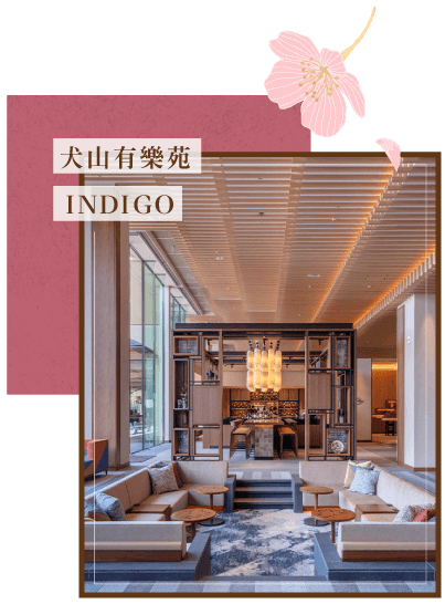犬山有樂苑INDIGO:「特奇攬勝,深入當地」是Indigo Hotel 宗旨;從飯店大廳落地大玻璃,完全開放的視野眺看「國寶犬山城」矗立山頂。聯合國教科文組織登記的無形文化遺產「犬山祭」,飯店前木曾川清流潺潺流過以及鵜飼等,感受犬山歷史的代表景象。