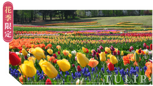 花季「安曇野鬱金香花季」353公頃的廣大佔地面積在春天時分種植著15萬顆鬱金香,一片花海顏色繽紛,春天賞花真正好。