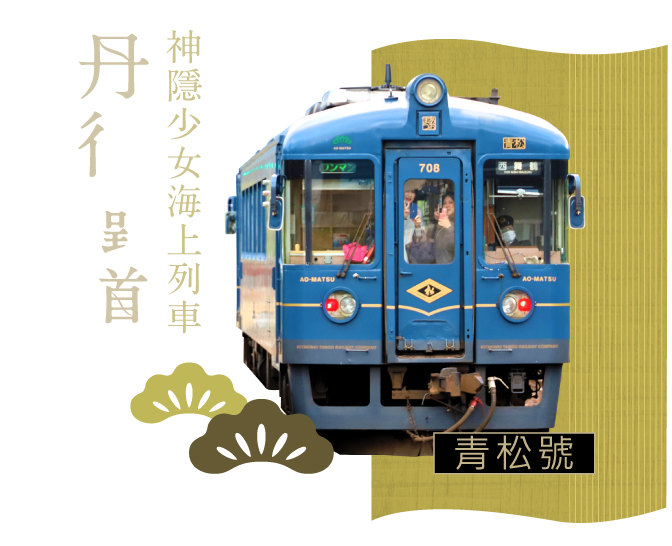 青松號鐵道行.「神隱少女」海上列車:九州七星列車設計大師-水戶岡銳治另一傑作。是以象征著天橋立的白砂青松的「松」為主題的觀光列車。將日本三景的天橋立與西舞鶴連接起來。運行通過絕景的奈具海岸以及由良川橋梁,享受絕色海景。車以溫木為內裝基調,設置有沙發席,櫃臺席,以及普通座椅,可從窗外享受絕美景觀。