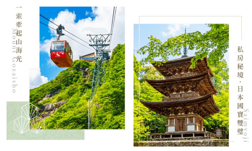 御在所岳.空中纜車.一索牽起山海光.奇岩立山巔 ~私房秘寺:湖東三山.西明寺.蓬萊庭.日本國寶雙璧 ~琵琶湖畔之宿:琵琶美學.蒼の湖邸 或 琵琶湖萬豪MARRIOTT ~琵琶湖夕陽美+美饌料理