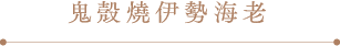 鬼殼燒伊勢海老,由經驗老道師傅抓捕與掌廚,想要捕獲龍蝦,必須在沒有月光的夜晚,到海邊灑網碰運氣,龍蝦抓上岸且客人點餐後,師傅會先將龍蝦烤熟,刷上醬汁再將龍蝦肉泡進私密醬汁缸內,並用噴火槍做出炙燒感,以上步驟重複數次,讓龍蝦從外到內都有醬汁陪襯。