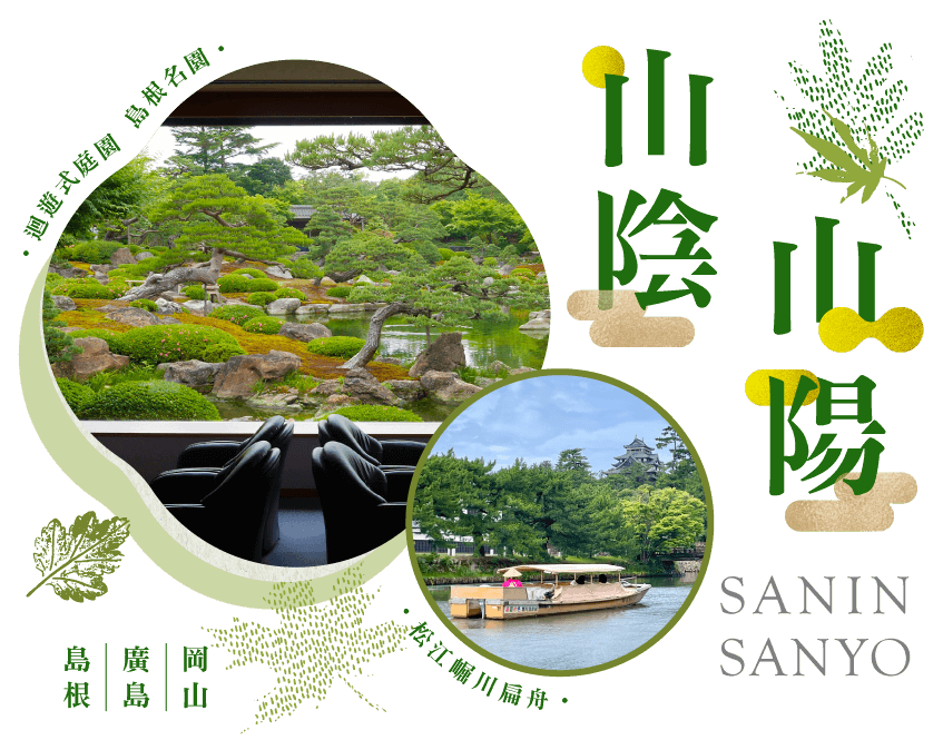 松江名景:舟遊松江崛川 ~松江旅色:【A. 松江城.天守閣.城山公園 或 B. 島根美術館.以水為題】 ~宍道湖.日本第七大湖 ~環境共生.松江花鳥園:貓頭鷹.鳥類表演.企鵝.溫室萬紫千紅「秋海棠」~依住宿安排:【A. 超美海絕景:出雲日御碕燈塔.日本海+經島 或 B. 電車體驗:一畑電車BATADEN 或 C. 季節限定:紫陽花寺.月照寺6月中旬-7月中旬】 ~山陰結緣湯宿