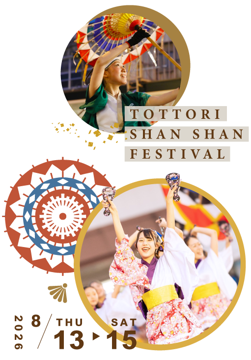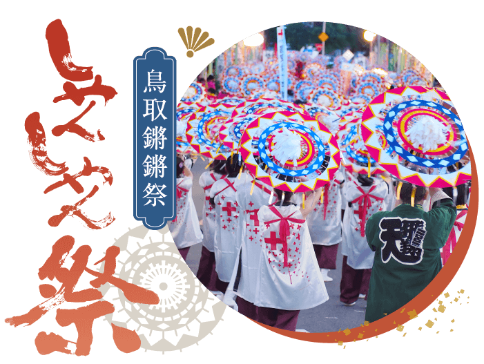 鳥取鏘鏘祭(前夜祭+主祭日):鏘鏘(音ㄑ一ㄤ)祭是「傘」祭意思。2014 年以「世界最大傘舞」登錄金氏世界紀錄。每年8月13日至8月15日共為期三天舉行。8月13日是炒熱祭典氣氛的前夜祭,第二天是祭典重頭戲,超過4000 舞者一同跳傘舞。