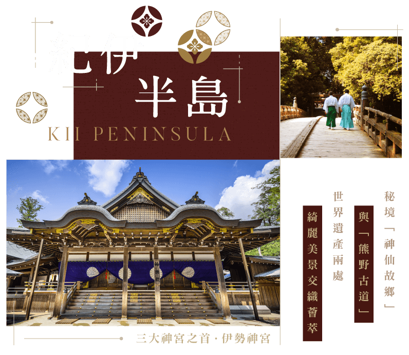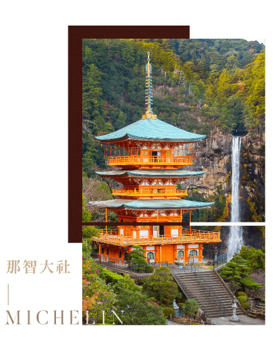 【著「平安裝」穿越時空.”熊野古道行”.大門坂約30分鐘】 ~日本第一名瀧.那智瀑布 ~米其林2星評鑑.「熊野三山」:那智大社+青岸渡寺.世界文化遺產 ~南紀海濱:【A. 日本百景:橋杭岩.岩柱林立 或 B. 白浜圓月島.夕陽無限好】 ~日本最古老三大名湯.白浜溫泉
