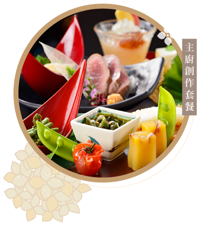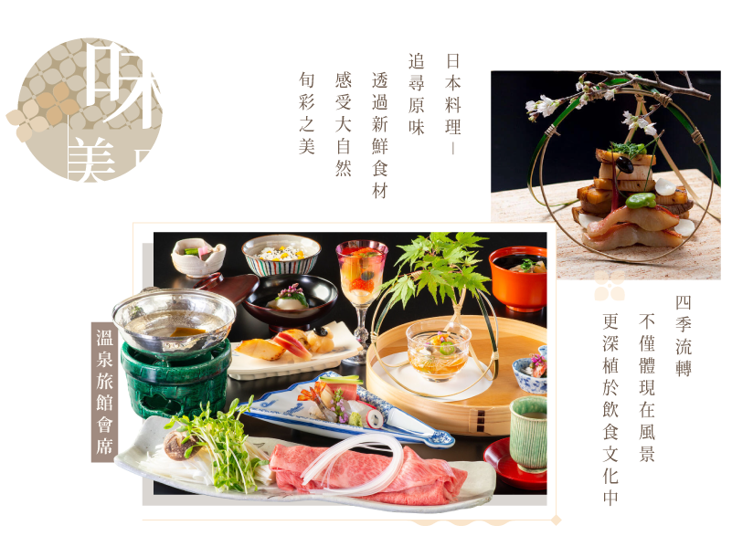 溫泉旅館會席:聽著風吹過山川草木聲音,看著窗外春櫻、夏綠、楓紅、雪舞;「款待的心」結合「和韻之美」,今晚,代表溫泉旅館的會席晚宴,就從第一品料理開始上演,邀請您親自細細品宴。