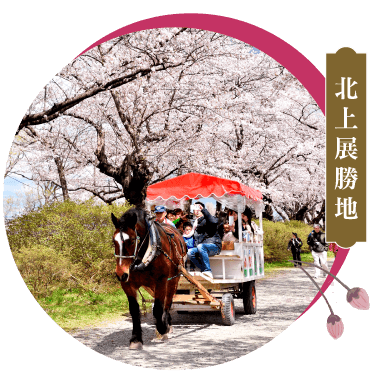 百選櫻名所-北上展勝地:(北上展勝地さくらまつり;期間限定:參考2024/04/04-04/29)。蔚藍的天空,鯉魚旗於川上飄揚,成千上萬株櫻花隨風搖曳,交織出被譽為「充滿愉悅的櫻木花道」。