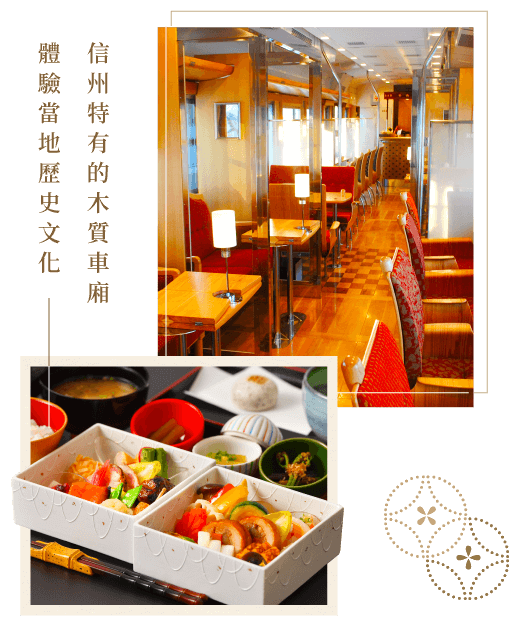 六文美食列車:整輛列車分為了三節車廂,車體內外設計、以至周邊商品都是由日本殿堂級列車設計師水戶岡鋭治一手打造,每一節都各有用途和設計,到處都能欣賞使用長野縣產木材打造的舒適空間。