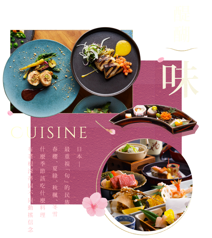 聽著風吹過山川草木聲音,看著窗外春櫻、夏綠、楓紅、雪舞;「款待的心」結合「和韻之美」,今晚,代表溫泉旅館的會席晚宴,就從第一品料理開始上演,邀請您親自細細品宴。