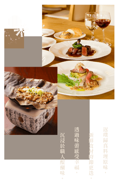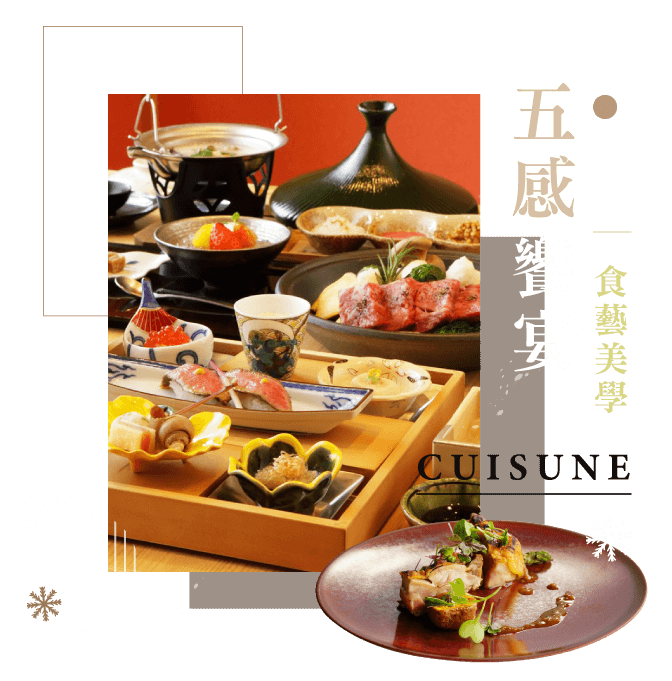 早餐: 飯店內享用早餐 午餐: 季節旬彩料理 或 主廚精緻和式料理 晚餐: 地元特色料理 或 異國創意料理