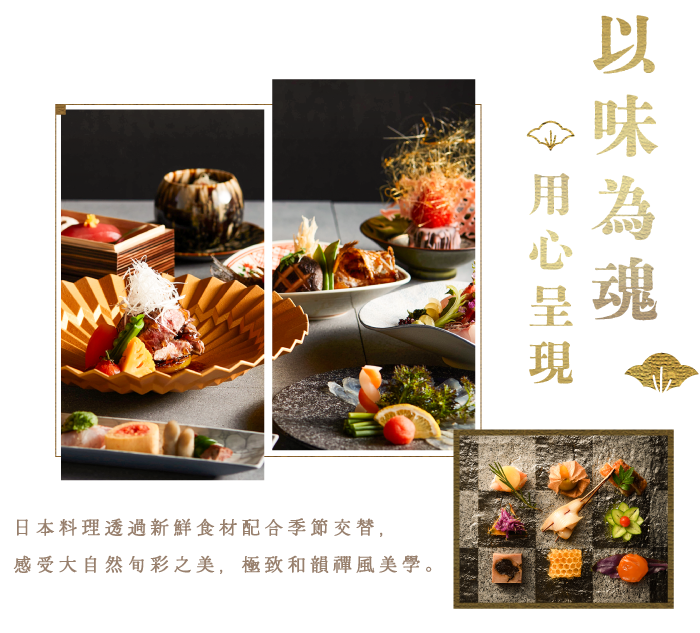 一場五感美學之食藝,等著您用「心」來細細品宴。「款待的心」結合大 自然四季旬彩,「和」韻之美就從第一品料理開始上演。