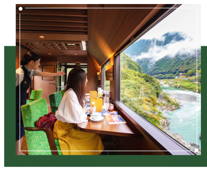 沿著波光粼粼河流翻山越嶺,列車全程約2小時,欣賞自然風光又重溫歷史的景觀列車。車上以當地食材烹調色香味俱全、及飽含著當地人深情厚誼的美酒和佳肴、工藝品等,用地方創生概念為乘客提供精緻的所有細節。享受無微不至的貼心服務及“大人的遊山”。