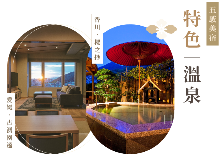 百選温泉旅遊,有“花之旅宿”之稱。視角200度的觀景大浴場「花樹海溫泉」可以眺望瀨戶內海與高松市,泉水主要成分是從花崗岩岩盤深處流淌而出飽含高濃度的氡氣,浴池擁有每分鐘200公升的豐富水量。