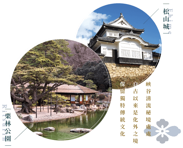 100名國寶城:松山城.『纜車』登最高海拔天守閣 ~季節安排.【金毘羅大芝居.金丸座劇場 或 B. 期間限定:新宮繡球花村(花六月下旬)】~琴平旅色:【A. 隨導遊攻頂.金毗羅金刀比羅宮.一生必訪景點 或 B. 溫泉飯店享受「我」的時光】 ~建議:金刀比羅「神椿」下午茶(自費)~香川溫泉吟撰宿