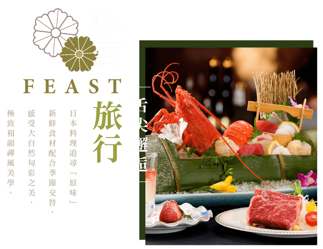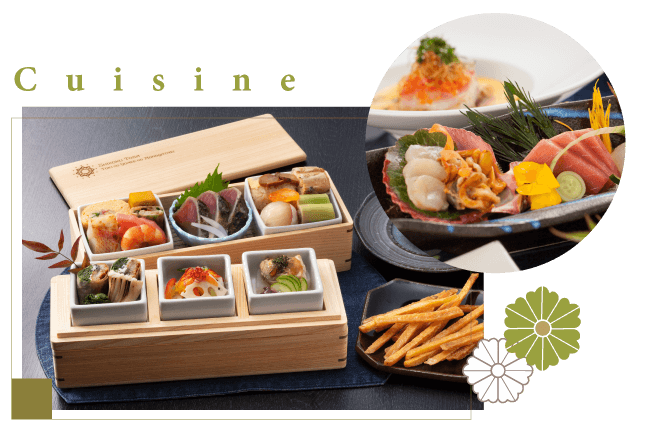 早餐: 飯店內享用早餐 午餐: 主廚季節旬彩料理 晚餐: 飯店內會席和御膳歡迎宴