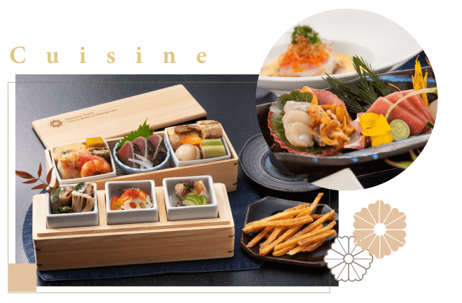 • 早餐: 飯店內享用早餐 午餐: 列車「開花之抄」特製食材 晚餐: 旬彩會席料理 或 平家鄉土會席 或 地元鰹魚料理 或 主廚創意套餐