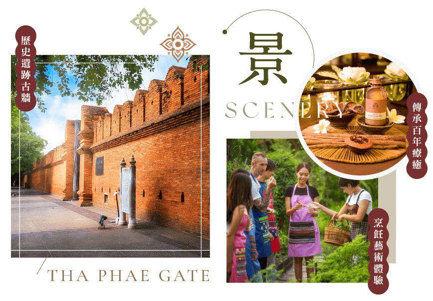 清邁,在泰文中意為『新城』,有著悠久的歷史地位。酒店矗立在清邁古城門側,褪色的紅磚牆與綠樹成蔭的護城河環繞著這座城市,我們可以透過寺廟窺見古典建築之美,複古建築元素融合了傳統的蘭納藝術,讓酒店的每個環境和角落都展現出與眾不同的迷人之處。